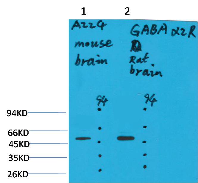 Western blot analysis of 1) Mouse Brain Tissue, 2)Rat Brain Tissue with GABA A Receptor α2 Rabbit pAb EA285 diluted at 1:2,000.