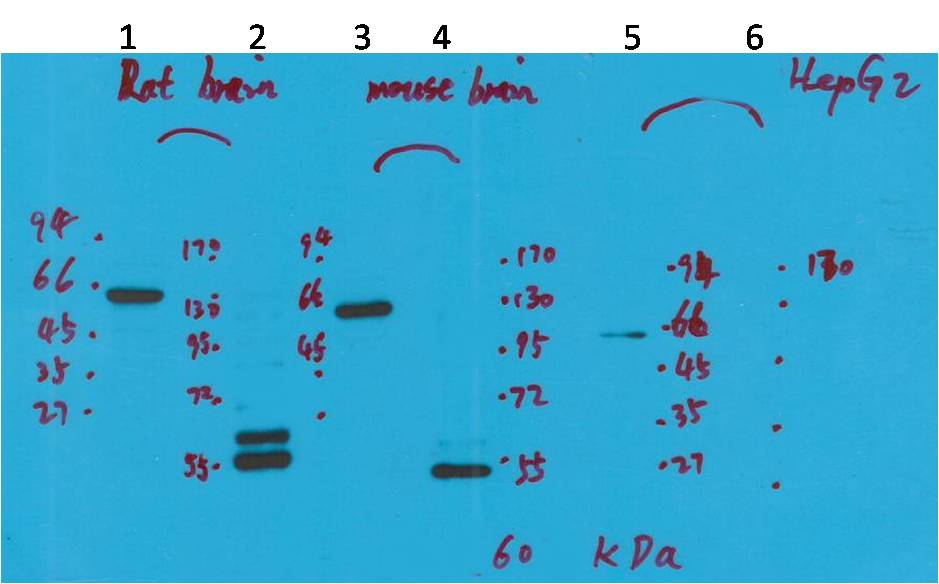Western blot analysis of 1) Rat Brain Tissue-Low Molecular Protein Marker, 2)Rat Brain Tissue-High Molecular Protein Marker, 3) Mouse Brain Tissue-Low Molecular Protein Marker, 4) Mouse Brain Tissue- High Molecular Protein Marker, 5) HepG2-Low Molecular P