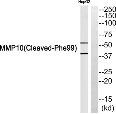 This gene encodes a member of the peptidase M10 family of matrix metalloproteinases (MMPs). Proteins in this family are involved in the breakdown of extracellular matrix in normal physiological processes, such as embryonic development, reproduction, and tissue remodeling, as well as in disease processes, such as arthritis and metastasis. The encoded preproprotein is proteolytically processed to generate the mature protease. This secreted protease breaks down fibronectin, laminin, elastin, proteoglycan core protein, gelatins, and several types of collagen. The gene is part of a cluster of MMP genes on chromosome 11. [provided by RefSeq, Jan 2016],
