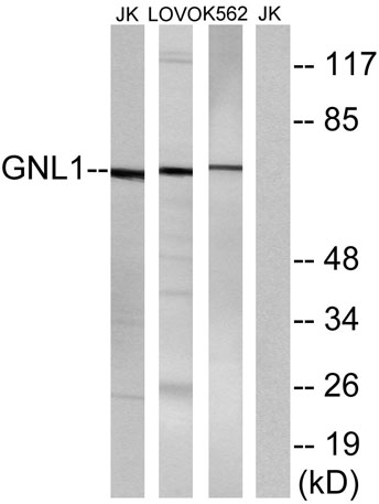 The antiserum was produced against synthesized peptide derived from human GNL1. AA range:61-110
