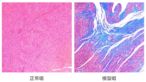 Masson染色結(jié)果:正常組大鼠心肌組織基本呈紅色,無明顯藍(lán)色膠原纖維化組織。模型組心肌纖維化較嚴(yán)重,大量膠原纖維增生,可見大片藍(lán)色心肌膠原沉積于心肌細(xì)胞及血管周圍。