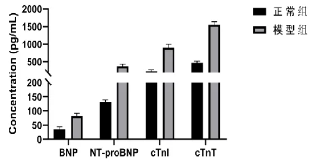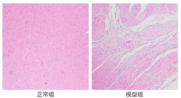 HE染色結(jié)果:正常組大鼠心肌纖維排列整齊有序,心肌細(xì)胞形態(tài)正常、輪廓清晰。模型組心肌細(xì)胞肥大、胞質(zhì)腫脹,邊界模糊不清,排列紊亂,細(xì)胞間隙明顯增寬,有炎性細(xì)胞浸潤,間質(zhì)內(nèi)可見毛細(xì)血管擴張增生。且心肌細(xì)胞損傷嚴(yán)重,呈小灶狀或片狀壞死。