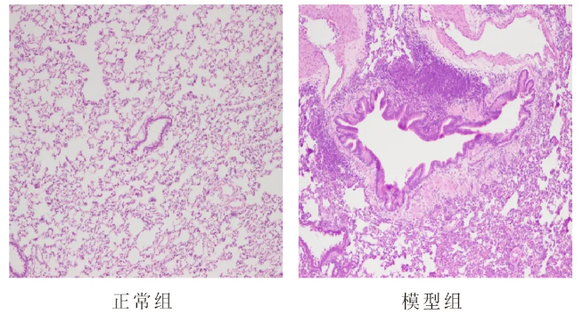 HE染色結(jié)果:正常組肺組織肺泡結(jié)構(gòu)正常,支氣管上皮結(jié)構(gòu)基本完整,無明顯脫落。模型組肺組織肺泡壁明顯增厚,肺泡腔縮小,間隔增寬,結(jié)構(gòu)紊亂;支氣管、血管周圍,以及肺間質(zhì)可見大量炎細(xì)胞浸潤;支氣管平滑肌及基底膜明顯增厚,氣道杯狀細(xì)胞增生,氣道黏膜不規(guī)則增生,部分支氣管內(nèi)有上皮細(xì)胞脫落。