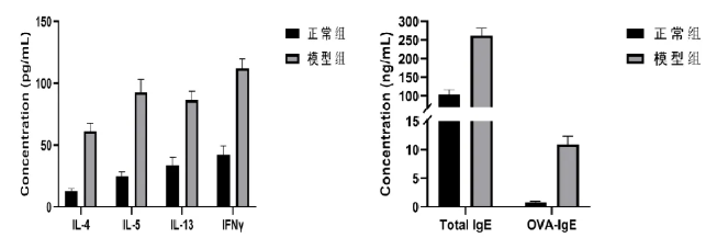 血清炎癥因子檢測結(jié)果:模型組血清IgE和IL4,IL5,IL13 IFNγ等炎癥因子含量較正常組明顯增加。