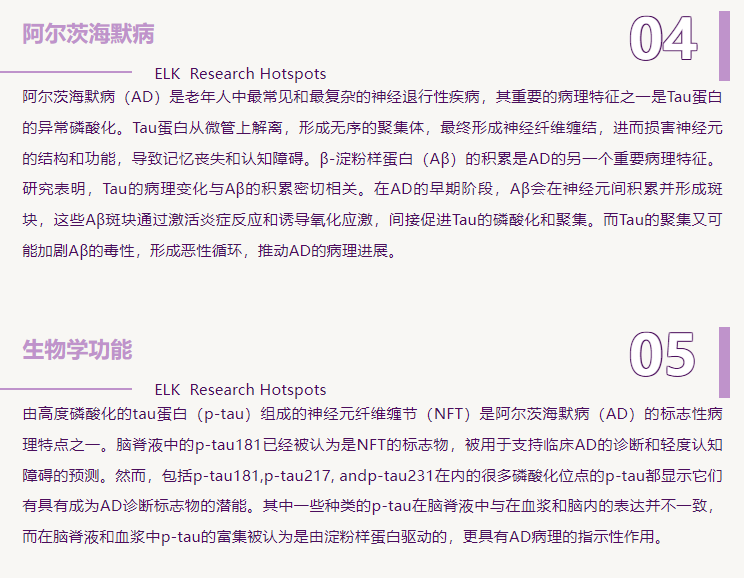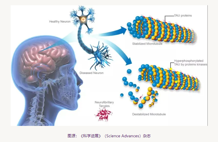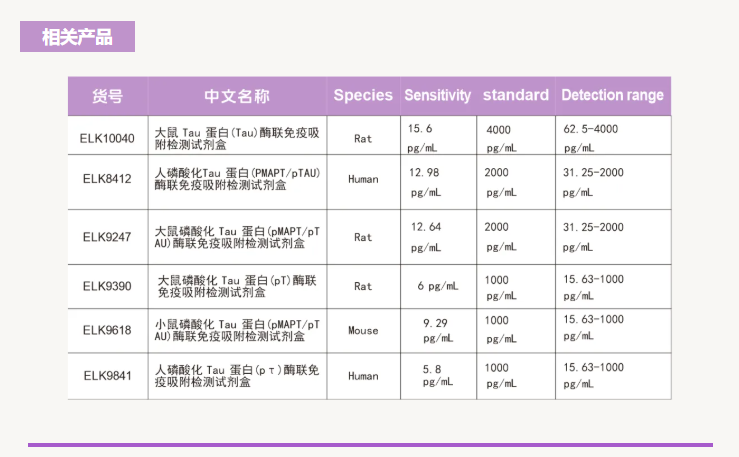 Tau蛋白是20世紀(jì)70年代中期通過研究微管形成所需的因素而發(fā)現(xiàn)的一種低分子量微管相關(guān)蛋白(microtubule associated protein,MAP),主要分布在中樞神經(jīng)系統(tǒng),多數(shù)存在于神經(jīng)元的軸突中,少數(shù)存在于少突膠質(zhì)細(xì)胞中。Tau蛋白分子量為45-50kDa,是一種含有352-441個氨基酸的微管相關(guān)蛋白,其經(jīng)典生物學(xué)功能是促進(jìn)微管組裝和維持微管的穩(wěn)定性。當(dāng)Tau蛋白發(fā)生高度磷酸化、異常糖基化、異常糖化以及泛素蛋白化時,Tau蛋白失去對微管的穩(wěn)定作用,神經(jīng)纖維退化、功能喪失。Tau 蛋白是神經(jīng)纖維纏結(jié)的主要組分,也是阿爾茨海默癥(AD) 等一系列神經(jīng)退行性疾病的標(biāo)記物。