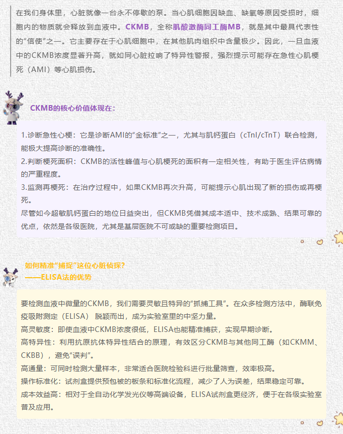 在我們身體里,心臟就像一臺(tái)永不停歇的泵。當(dāng)心肌細(xì)胞因缺血、缺氧等原因受損時(shí),細(xì)胞內(nèi)的物質(zhì)就會(huì)釋放到血液中。CKMB,全稱肌酸激酶同工酶MB,就是其中最具代表性的“信使”之一。它主要存在于心肌細(xì)胞中,在其他肌肉組織中含量極少。因此,一旦血液中的CKMB濃度顯著升高,就如同心臟拉響了特異性警報(bào),強(qiáng)烈提示可能存在急性心肌梗死(AMI)等心肌損傷。