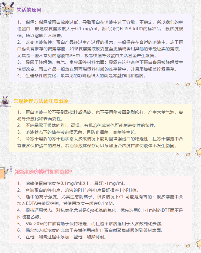 總體來(lái)看蛋白是一種比較脆弱和敏感的物質(zhì),不穩(wěn)定,且每種蛋白質(zhì)由于序列不同構(gòu)象不同,導(dǎo)致穩(wěn)定性特征以及適用的環(huán)境不同,需要實(shí)驗(yàn)來(lái)驗(yàn)證,對(duì)于收到蛋白產(chǎn)品后最佳的方式就是按照說(shuō)明書后續(xù)處理并盡快完成實(shí)驗(yàn)最為穩(wěn)妥。