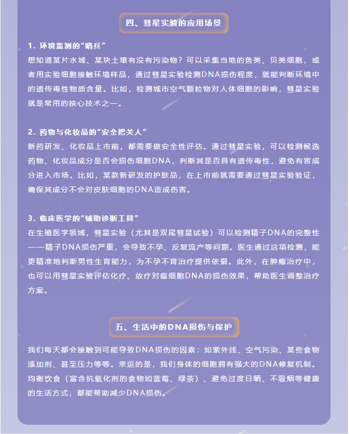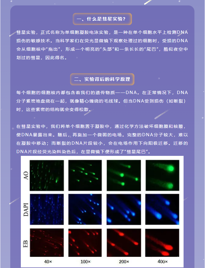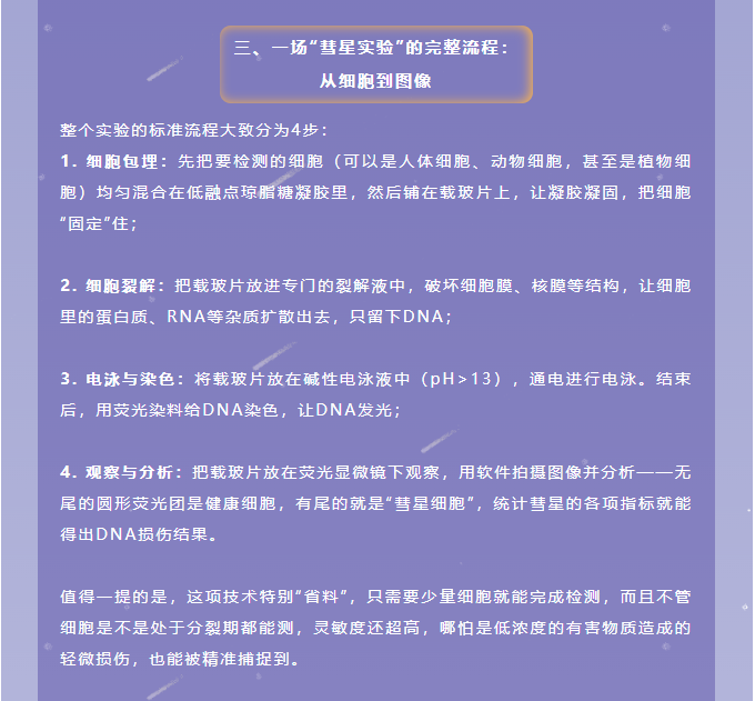 彗星尾巴的長度和亮度與DNA損傷的程度直接相關:損傷越嚴重,“尾巴”越長、越亮。