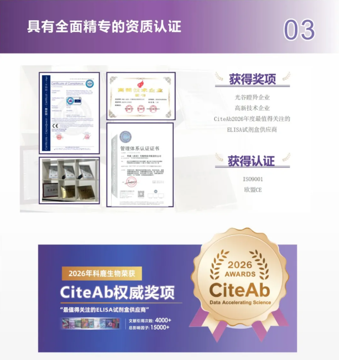 在2026年國際知名生命科學產(chǎn)品搜索引擎與數(shù)據(jù)平臺CiteAb發(fā)起的年度評選中,ELK(科鹿生物)憑借龐大而穩(wěn)定的文獻引用數(shù)據(jù)及優(yōu)秀的用戶口碑,成功榮獲“CiteAb2026年度最值得關(guān)注的ELISA試劑盒供應(yīng)商”重磅獎項。