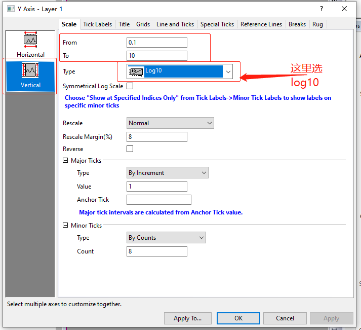橫縱坐標(biāo)選擇Log10參數(shù),注意from / to 的上下限值的選擇,完成后單擊OK 鍵
