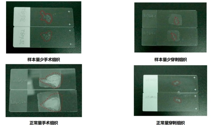 RNA提取一次提取<80μm。從醫(yī)院病理科切取組織厚度約為10-20μm的石蠟卷片,手術(shù)組織10張(組織>1×1cm2),或20張(組織<1×1cm2),穿刺組織20-25張。將切好的卷片放置于耐-192℃超低溫螺紋口凍存管,迅速浸入液氮速凍>1h, -80℃保存或者干冰運(yùn)輸。