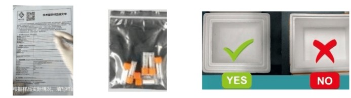 ② 將樣本放入自封袋中,在樣本提交單上填好樣本詳細(xì)信息(編號等信息必須嚴(yán)格與樣本管上一致),將填好的樣本單和樣本一起放入泡沫箱中;