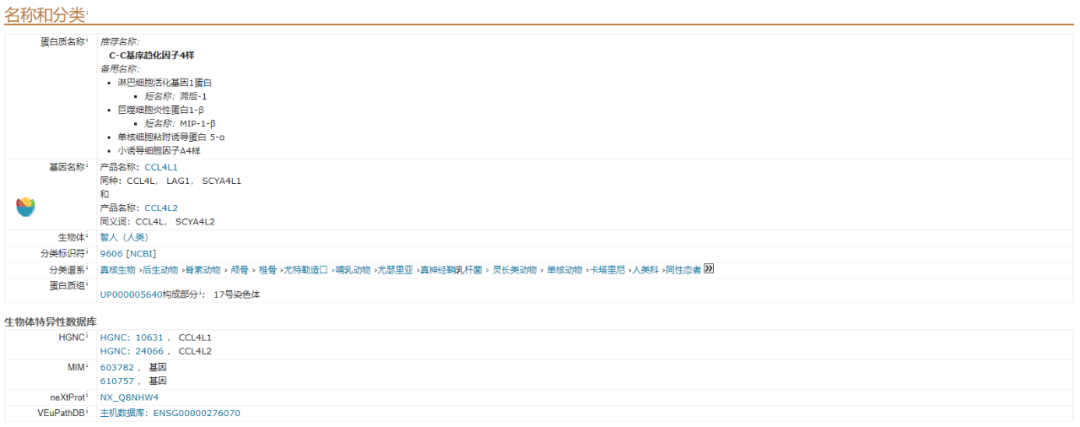 對(duì)于科研試劑銷售工作者來(lái)說(shuō),用的比較多的是這個(gè)板塊,該板塊展示的是命名(其中包括蛋白名,基因名)和來(lái)源種屬信息,如需要可以直接跳轉(zhuǎn)到NCBI、Enzem數(shù)據(jù)庫(kù)進(jìn)行查詢。