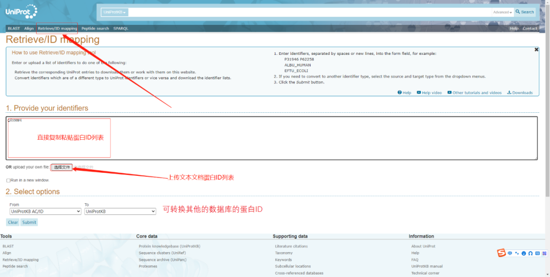 假如需要查詢的蛋白較多,則可以通過(guò)點(diǎn)擊首行任務(wù)欄Retrieve/ID mapping,如下圖,查詢蛋白列表可直接粘貼在下圖1. Provide your identifiers文本框中,也可以將蛋白ID單列粘貼于TXT文本中提交到網(wǎng)站。另外該頁(yè)面2. Select options 還可提供ID轉(zhuǎn)換功能,支持多種數(shù)據(jù)庫(kù)間的ID轉(zhuǎn)換。
