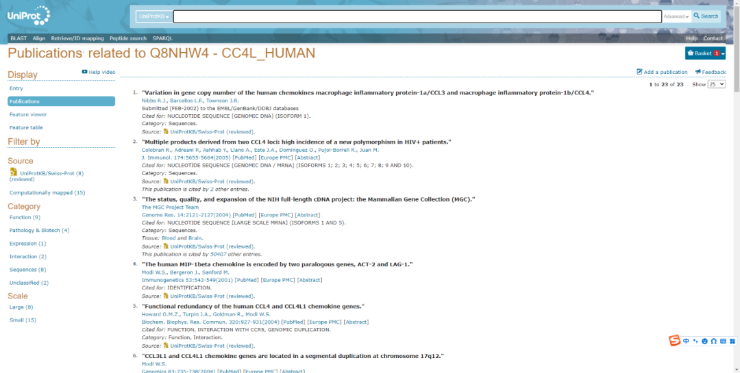 點(diǎn)擊Display下Publications按鈕,數(shù)據(jù)庫(kù)會(huì)展示該蛋白發(fā)表已經(jīng)收錄的文章。