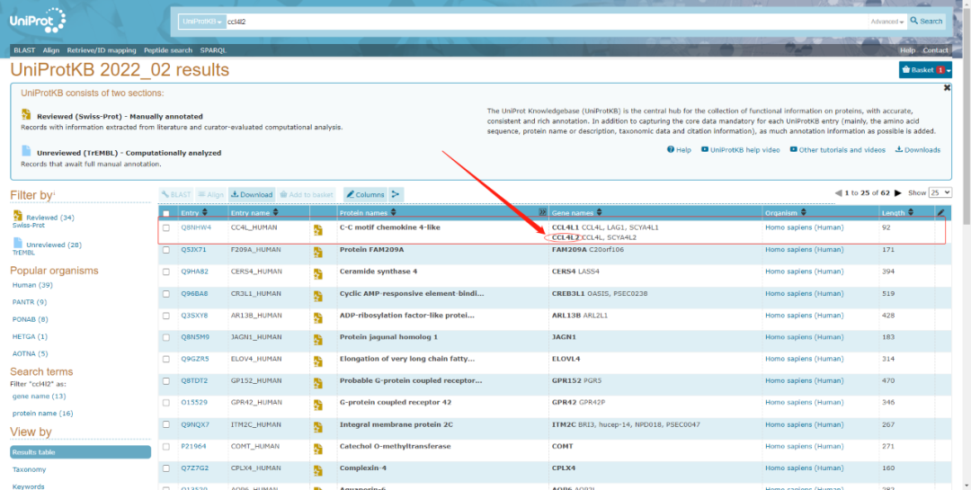 UniProt 數(shù)據(jù)庫(kù)中,UniProtKB/Swiss-Prot 是我們最常用的,今天我們主要介紹這個(gè)數(shù)據(jù)庫(kù)的使用。我們?cè)谳斎霗谥休斎隒CL4L2,點(diǎn)擊search,就會(huì)出現(xiàn)不同物種該蛋白的詳細(xì)信息。找到我們想要的物種條目,點(diǎn)擊進(jìn)入。