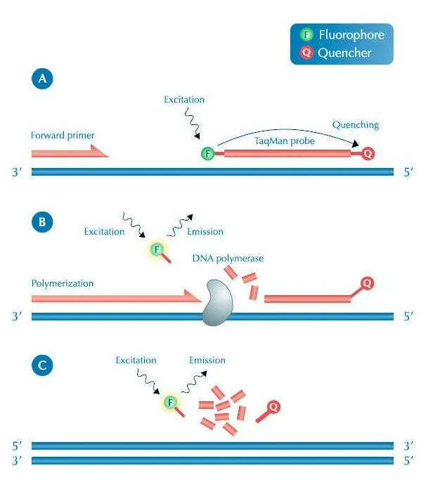 目前根據(jù)不同的熒光物質(zhì),我們可以大致將qPCR分為兩種。一種是用熒光染料,主要為SYBRGreenⅠ染料,該染料能與DNA雙鏈結(jié)合,結(jié)合之后會(huì)顯示熒光信號(hào),而在沒(méi)有結(jié)合的時(shí)候幾乎檢測(cè)不到熒光信號(hào),隨著拷貝數(shù)的增加,熒光信號(hào)增強(qiáng)。而還有一種是使用熒光探針,又叫TaqMan探針?lè)ǎ湓硎歉鶕?jù)目的基因設(shè)計(jì)一個(gè)能與之特異性結(jié)合的熒光探針,該探針包含兩個(gè)基團(tuán):一個(gè)熒光基團(tuán)和一個(gè)淬滅基團(tuán),正常情況下因?yàn)榇銣缁鶊F(tuán)的存在導(dǎo)致熒光基團(tuán)無(wú)法發(fā)出熒光,而在擴(kuò)增時(shí)探針結(jié)合到DNA的模板上,并且擴(kuò)增到探針位置時(shí)兩個(gè)基團(tuán)被切開,從而熒光基團(tuán)可以發(fā)出熒光,同樣隨著拷貝數(shù)的增加,熒光信號(hào)增強(qiáng)。
