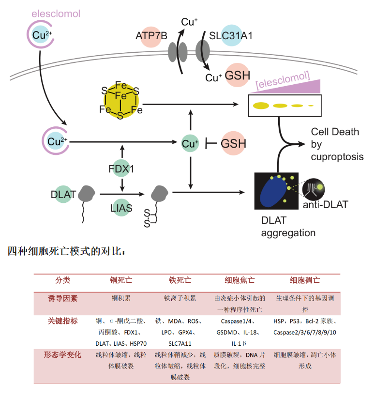 2022年3月在《Science》上發(fā)表題為Copper induces cell death by targeting lipoylated TCA cycle proteins的文章中,研究人員將一種發(fā)生機(jī)制明顯區(qū)別于已知的細(xì)胞凋亡、細(xì)胞焦亡及鐵死亡的受控性細(xì)胞死亡方式,命名為“銅死亡”(Cuproptosis)。研究人員發(fā)現(xiàn)銅死亡依賴于線粒體呼吸--銅離子通過直接結(jié)合三羧酸循環(huán)途徑中的硫辛酰化蛋白,導(dǎo)致硫辛酰化蛋白異常聚集,并干擾呼吸鏈復(fù)合體中的鐵硫簇蛋白,進(jìn)而引發(fā)蛋白質(zhì)毒性應(yīng)激,最終致使細(xì)胞死亡。