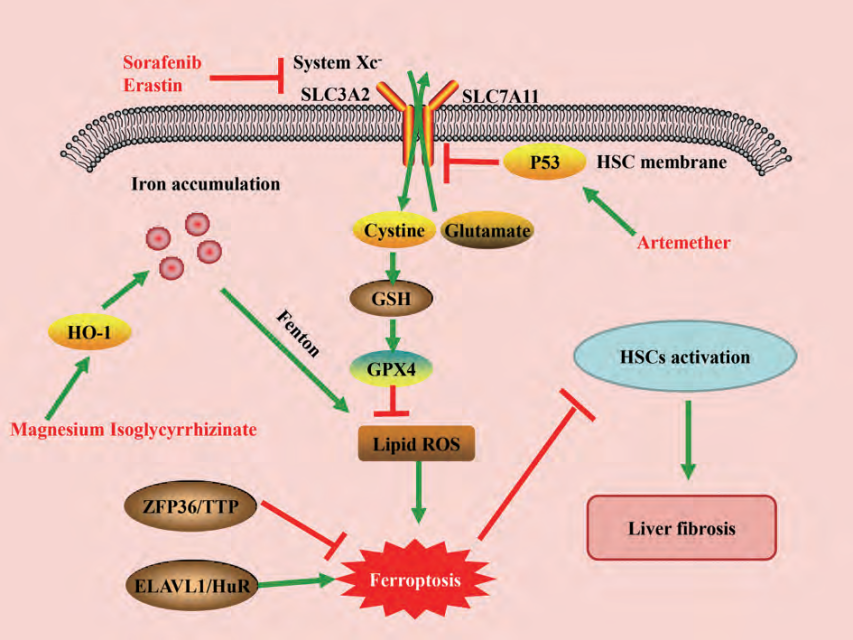 圖1:鐵死亡在肝纖維化中的相關(guān)調(diào)控途徑