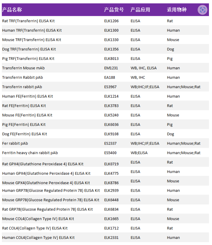 作為生命科學(xué)及醫(yī)學(xué)領(lǐng)域的蛋白抗體供應(yīng)商,ELK biotechnology可為鐵死亡相關(guān)研究提供高品質(zhì)的試劑,這里將鐵死亡部分產(chǎn)品列出來(lái)以便大家參考,詳情見(jiàn)下表: