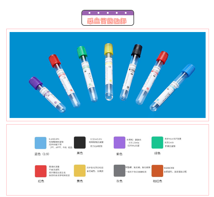 紫色頭蓋:又叫EDTA抗凝管,一般是用于普通的血液學(xué)檢測,但是不適用于凝血實(shí)驗(yàn)及血小板功能的檢測,也不能用于鈉、鉀、鈣、鐵、堿性磷酸等的測定;