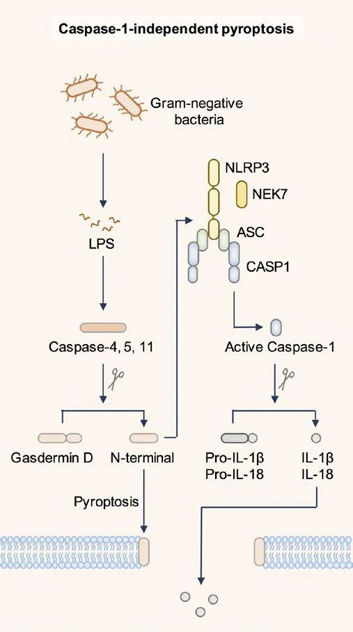 caspase-4/5/11介導(dǎo)的非典型途徑:在非經(jīng)典細(xì)胞焦亡途徑中,LPS可以直接與Capase-4/5/11結(jié)合,一方面,活化的Caspase-4/5/11可以裂解GSDMD蛋白,GSDMD蛋白N端既可以介導(dǎo)細(xì)胞膜溶解與細(xì)胞焦亡,還可以激活NLRP3炎癥小體來活化Caspase-1,最終產(chǎn)生IL-1β并外釋;另一方面,活化的Caspase-4/5/11激活通道Pannexin-1,釋放ATP以開放胞膜通道P2X7,使細(xì)胞膜形成小孔誘導(dǎo)細(xì)胞焦亡,激活的Pannexin-1還通過外釋K+激活NLRP3炎癥小體,最終產(chǎn)生IL-1β并外釋。