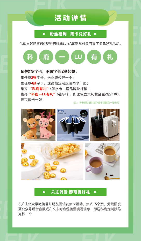 1.即日起購(gòu)買(mǎi)96T規(guī)格的科鹿ELISA試劑盒 可參與集卡兌好禮活動(dòng)。