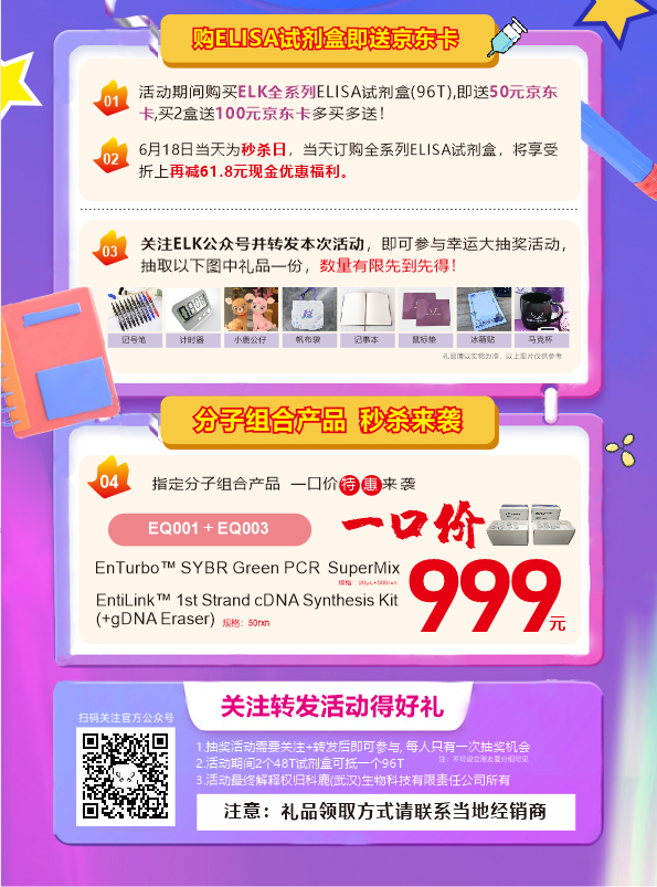 購買有禮:活動期間購買96T ELISA試劑盒即送50元京東卡一張,買2盒送100元京東卡多買多送!
